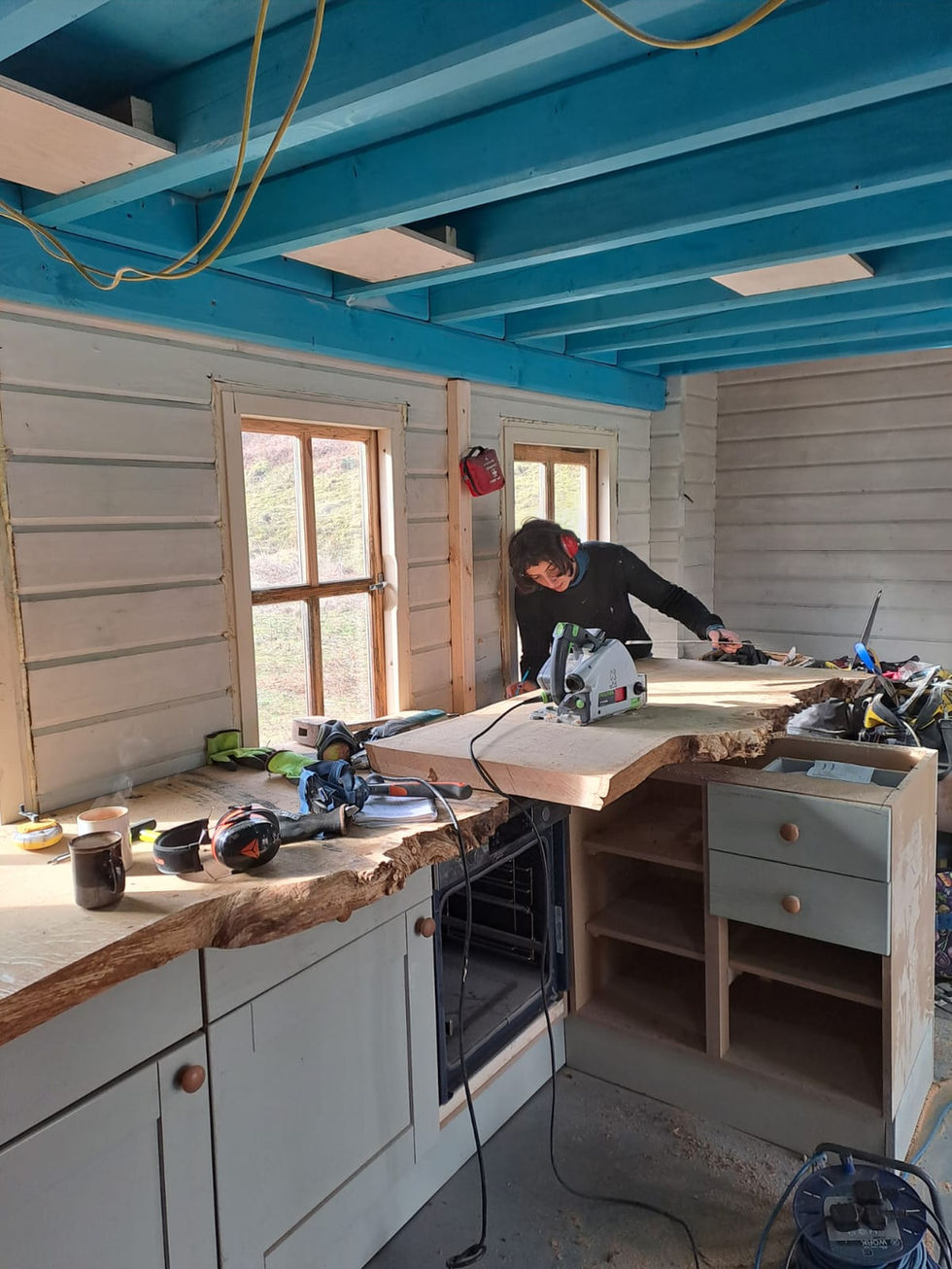 Turning a shed into a practical beautiful commercial kitchen! We were given the challenge of refurbishing a second-hand kitchen in a new space. Completing it with a 70mm thick waney edged solid oak counter. To adapt the carcasses to fit the new space we used birch ply to clad the backs and built a bi-folding corner door. We also inset a slab of marble to act as a heat proof counter space.